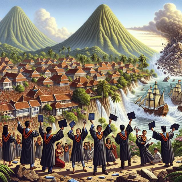 Prompt: Generate an image of a vibrant tropical Indonesian village, set against a majestic mountain landscape. In the foreground, a joyous group of students wearing graduation caps and gowns celebrate with their Associates degrees in Communications technologies. As they raise their diplomas in triumph, a landslide on the mountain unfolds, with rocks tumbling down the slope. In the distant background, a pirate ship sails past the village, indicating the historical frequency of pirate attacks in the area. The depiction should include only scenes, people, and objects, it should not include text or speech bubbles.
