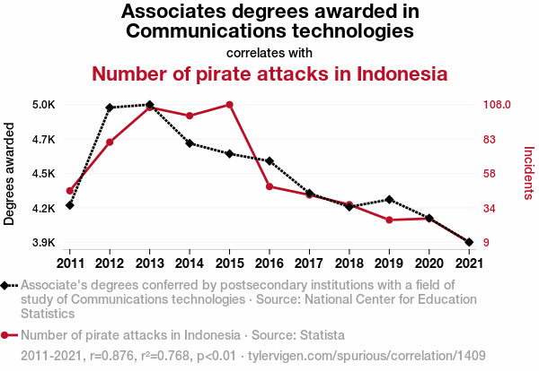 associates degrees, communications technologies, pirate attacks, Indonesia, correlation coefficient, statistical analysis, National Center for Education Statistics, Statista, educational pursuits, maritime mischief, dad joke, unexpected correlations, data analysis