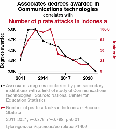 This means 76.8% of the change in the one variable (i.e., Number of pirate attacks in Indonesia) is predictable based on the change in the other (i.e., Associates degrees awarded in Communications technologies) over the 11 years from 2011 through 2021.