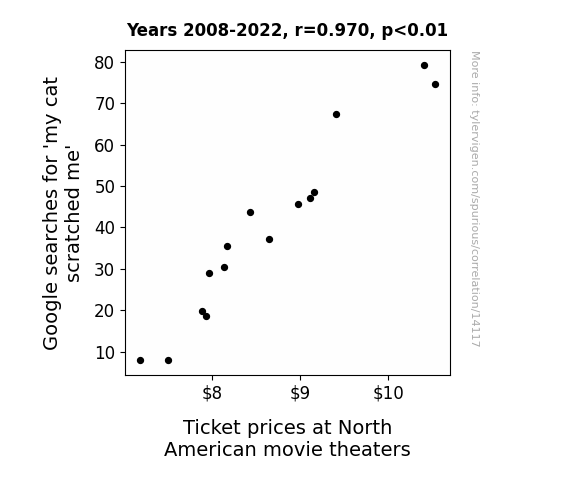 This means 94.1% of the change in the one variable (i.e., Ticket prices at North American movie theaters) is predictable based on the change in the other (i.e., Google searches for 'my cat scratched me') over the 15 years from 2008 through 2022.