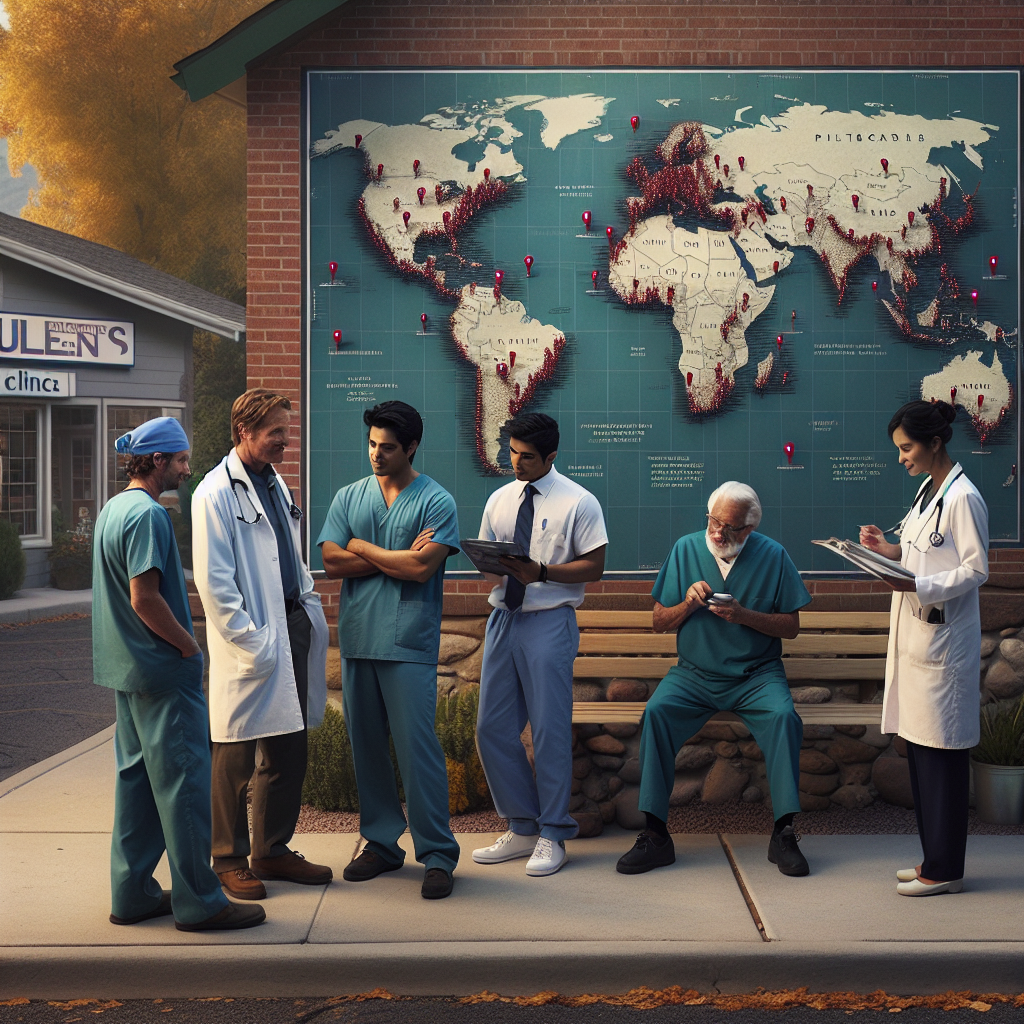 ChatGPT: Generate an image illustrating a serene scene in a Utah town, where medical appliance technicians are engaged in discussion outside a clinic. The technicians are seen grouped together, absorbed in their work, with a world map displayed on the clinic wall depicting recent pirate attacks at sea. Emphasize the juxtaposition of the technicians' focused demeanor and the ominous reminder of global challenges. Lastly, ensure the overall tone of the image aligns with the prestigious and insightful style of a Discovery magazine cover.