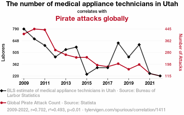 This means 49.3% of the change in the one variable (i.e., Pirate attacks globally) is predictable based on the change in the other (i.e., The number of medical appliance technicians in Utah) over the 14 years from 2009 through 2022.