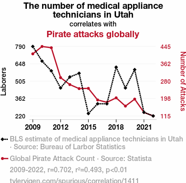 prosthetic technicians, medical appliance technicians, Bureau of Labor Statistics, Statista, Utah, pirate attacks, correlation coefficient, maritime exploits, healthcare professions