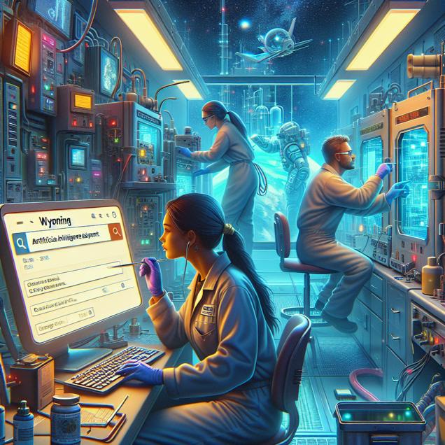 ChatGPT: Generate an image that resembles a scene from 'Star Wars' in a small laboratory in Wyoming, where a chemical equipment operator is attentively monitoring the equipment while a tender conducts maintenance. In the corner, a computer displays a search for "who is alexa" on the Google homepage. The setting should exude a futuristic and technological environment reminiscent of 'Star Wars.'