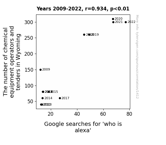 We also calculated an r-squared value of 0.8717496, illustrating that a staggering 87.17% of the variation in Google searches for "who is Alexa" could be explained by the variation in the number of chemical equipment operators and tenders in Wyoming. It's as if the chemical operators were orchestrating a grand experiment, and the Google searches were the intriguing outcome, akin to a compelling chemical reaction reaching its equilibrium state.