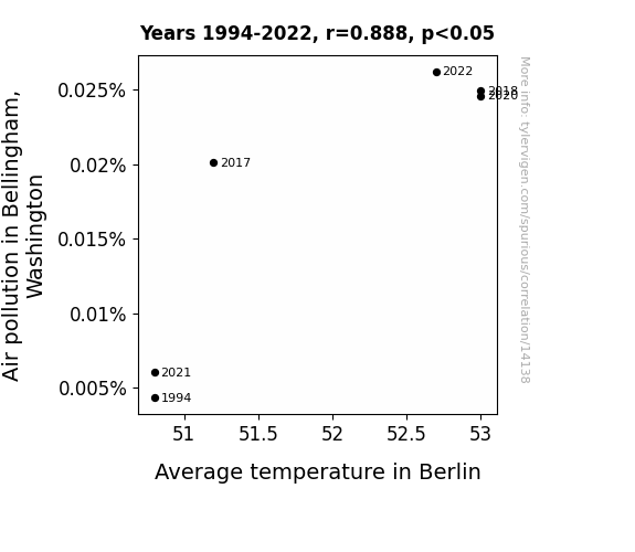 This means 78.9% of the change in the one variable (i.e., Average temperature in Berlin) is predictable based on the change in the other (i.e., Air pollution in Bellingham, Washington) over the 6 years from 1994 through 2022.