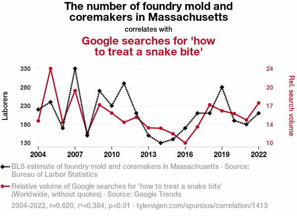 This means 38.4% of the change in the one variable (i.e., Google searches for 'how to treat a snake bite') is predictable based on the change in the other (i.e., The number of foundry mold and coremakers in Massachusetts) over the 19 years from 2004 through 2022.