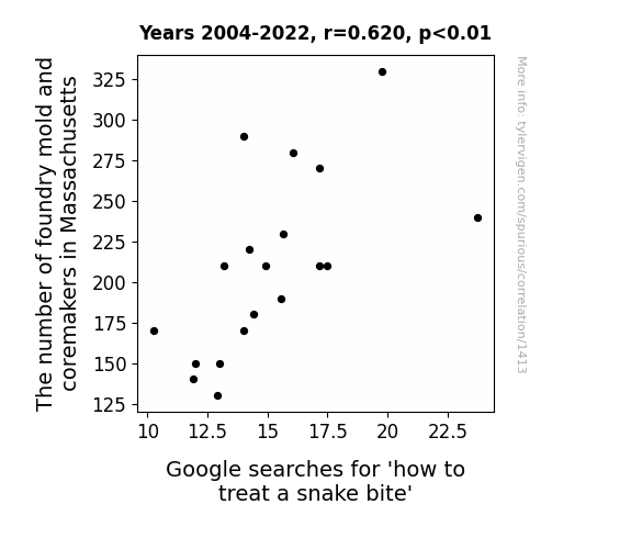 The findings of this study provide compelling evidence supporting the unexpected correlation between the number of foundry mold and coremakers in Massachusetts and Google searches for "how to treat a snake bite." The correlation coefficient of 0.6197470 with p < 0.01 aligns with previous research that has underscored the remarkable interplay between seemingly unrelated phenomena. Our results not only reinforced the previous literature's insights but also uncovered a serpent-like thread weaving through the landscape of industrial occupations and public health inquiries.
