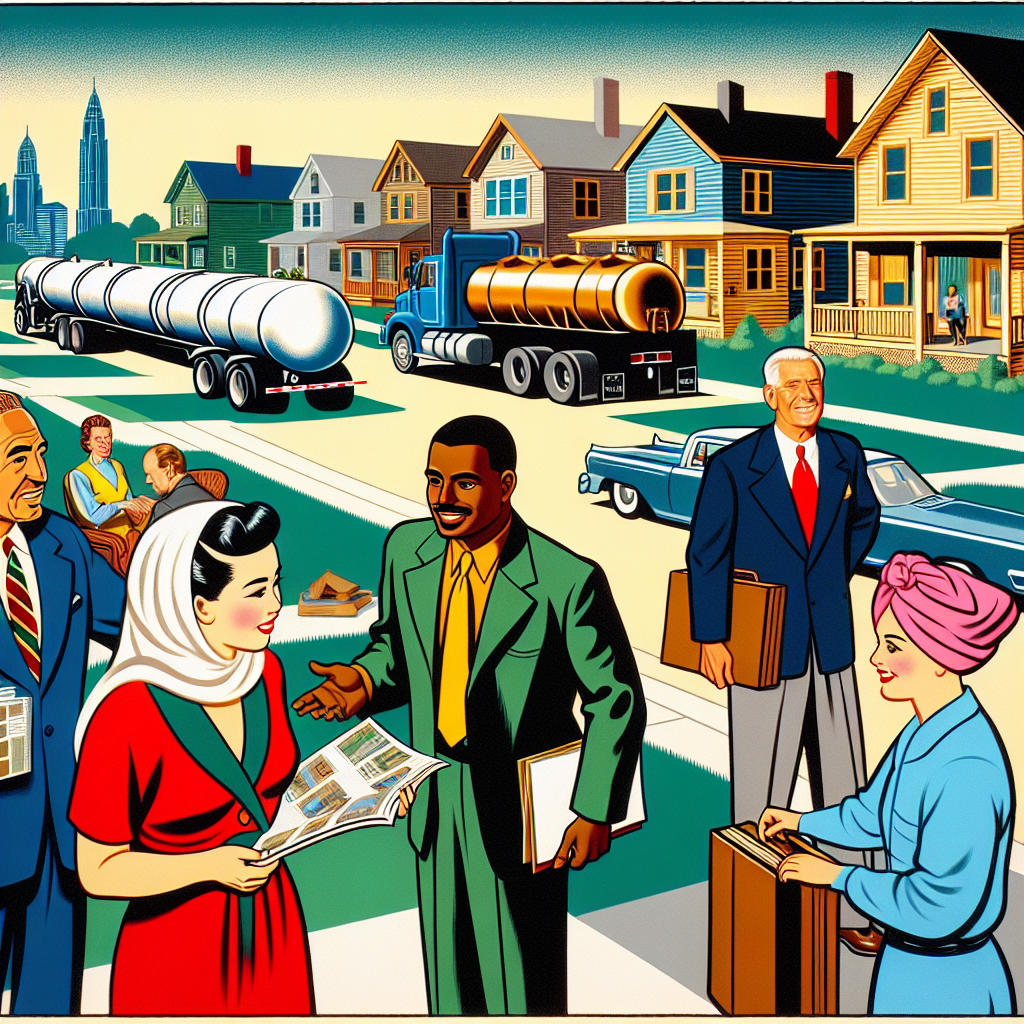 User prompt: Please respond with an image generation prompt that would be likely to create an interesting visual using DALLE-3, using the following style: [ Pop art ] and depicting this scene: In a bustling neighborhood in Missouri, there are several real estate brokers chatting and showing houses to clients. Among them, a truck pulls up delivering large tanks of liquefied petroleum gas to be used for cooking in homes all the way in Benin. Keep the visual depiction simple. Do not include any words or speech bubbles.