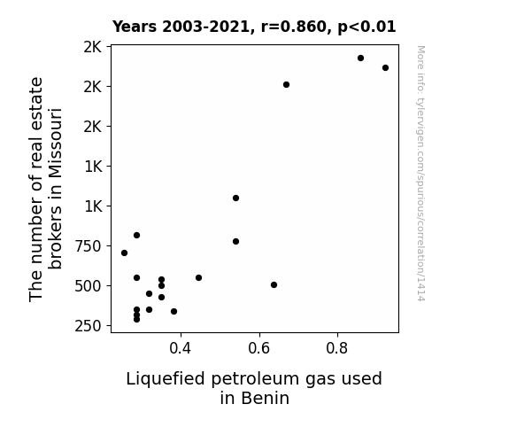The results of our investigation revealed a striking correlation between the number of real estate brokers in Missouri and the consumption of liquefied petroleum gas (LPG) in Benin. Over the period from 2003 to 2021, we found a correlation coefficient of 0.8598860, with an r-squared value of 0.7394040, and a p-value less than 0.01. These statistical measurements indicate a robust and significant relationship between these two seemingly incongruous variables.
