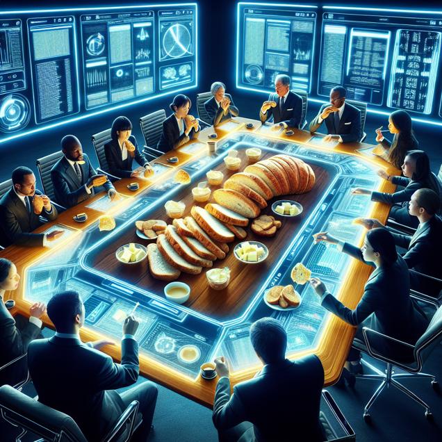 ChatGPT: Generate an image of a high-tech, modern law office in New Mexico. The scene features a group of lawyers huddled around a sleek, glass-topped table. The table is lined with built-in touch screens displaying case files and legal documents. The lawyers are engrossed in discussion, their faces illuminated by the soft glow of the digital screens. As they converse, they are seen sipping on steaming cups of coffee. In the center of the table, a plate of freshly baked bread is displayed, adorned with evenly sliced pieces of golden-brown goodness. Each slice is generously topped with a dollop of creamy butter, and some lawyers are captured in the act of spreading the butter across the warm, fragrant bread. The juxtaposition of cutting-edge technology and the simple act of savoring a comforting snack creates an intriguing scene.