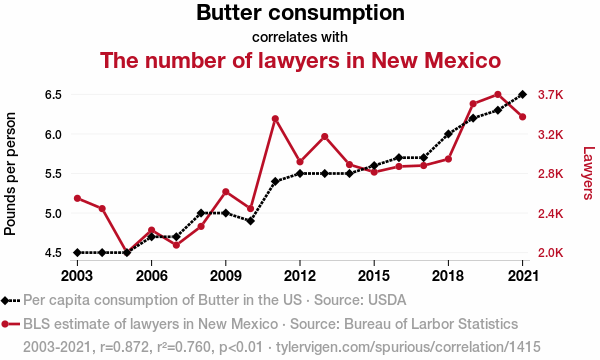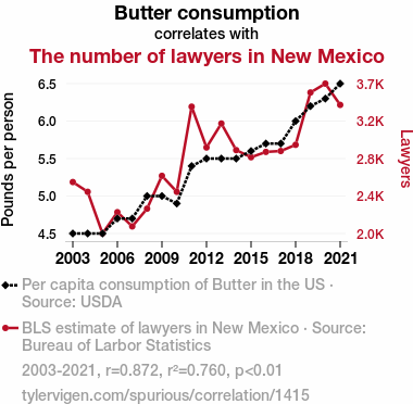 - The spurious research paper: Spreading the Law: A Butterly Connection Between Butter Consumption and the Buoyancy of Lawyers in New Mexico