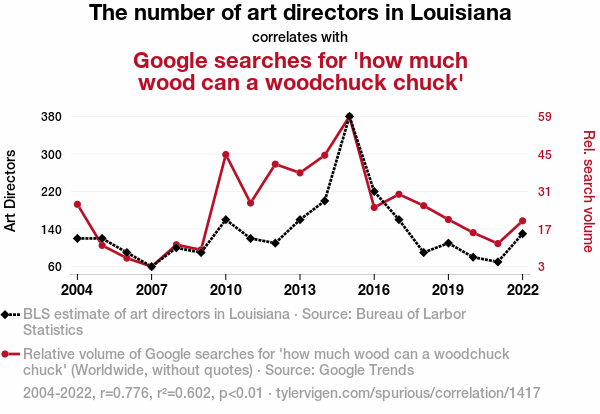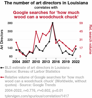 This means 60.2% of the change in the one variable (i.e., Google searches for 'how much wood can a woodchuck chuck') is predictable based on the change in the other (i.e., The number of art directors in Louisiana) over the 19 years from 2004 through 2022.