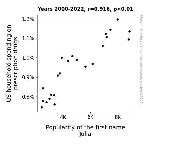 This means 83.9% of the change in the one variable (i.e., Popularity of the first name Julia) is predictable based on the change in the other (i.e., US household spending on prescription drugs) over the 23 years from 2000 through 2022.