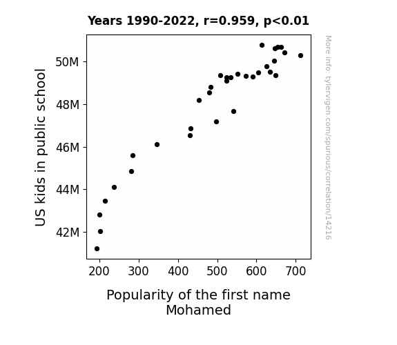 This means 92% of the change in the one variable (i.e., Popularity of the first name Mohamed) is predictable based on the change in the other (i.e., US kids in public school) over the 33 years from 1990 through 2022.