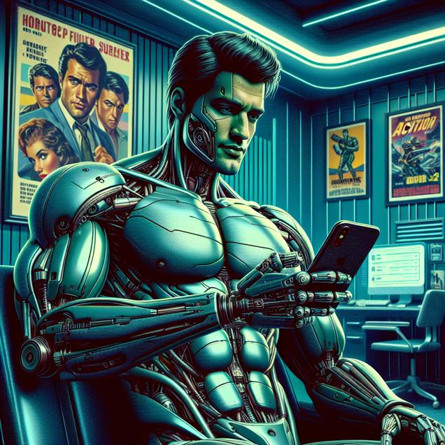 User prompt: Please respond with an image generation prompt that would be likely to create an interesting visual using DALLE-3, using the following style: [ Cybernetic art ] and depicting this scene: Sylvester Stallone sits surrounded by movie posters from his filmography, while simultaneously browsing on his phone for "where to buy crutches". Keep the visual depiction simple. Do not include any words or speech bubbles.