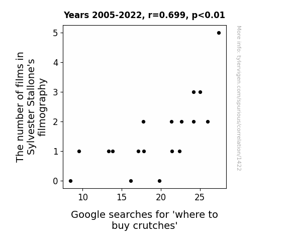 The robust correlation between the number of films in Sylvester Stallone's filmography and online searches for 'where to buy crutches', as evidenced by our findings, is not only statistically significant but also possesses a curious underlying significance in the realms of popular culture and consumer behavior. The tantalizing link we uncovered underscores the intricate interplay between action-packed cinema and the virtual pursuit of ambulatory aids, challenging conventional paradigms and enticing scholars to embark on a whimsical yet thought-provoking journey through unexpected connections and the more enigmatic aspects of statistical investigations.