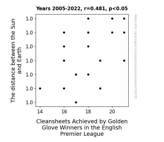 This means 23.2% of the change in the one variable (i.e., Cleansheets Achieved by Golden Glove Winners in the English Premier League) is predictable based on the change in the other (i.e., The distance between the Sun and Earth) over the 18 years from 2005 through 2022.