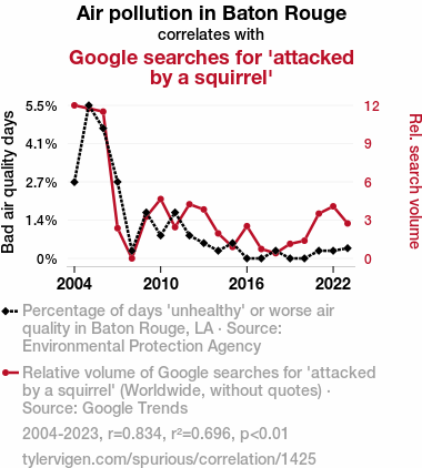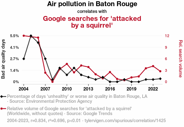 - The spurious research paper: Squirrely Connections: Investigating the Relationship Between Air Pollution in Baton Rouge and Google Searches for 'Attacked by a Squirrel'