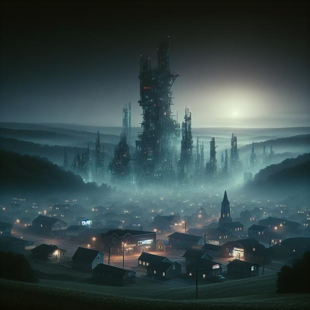 ChatGPT: An image that looks like it is a scene from 'Star Wars,' depicting a dystopian cityscape in Somerset, Pennsylvania. Amidst the thick haze, tall metallic structures rise, casting eerie shadows in the obscured city streets. Flashing police sirens and distant silhouettes of law enforcement depict the urgency of the situation, hinting at a troubled community struggling under the heavy environmental and social burdens.