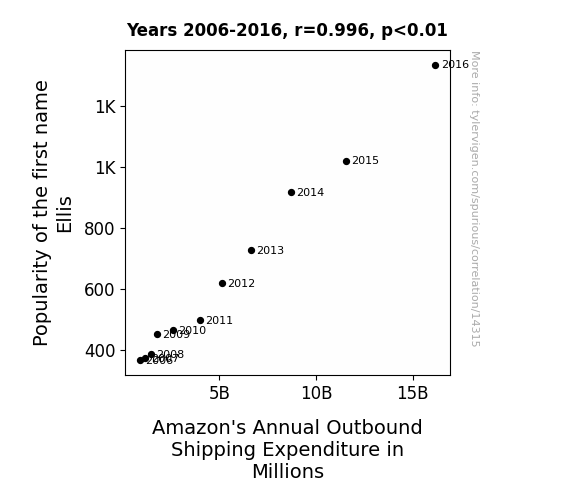 This means 99.1% of the change in the one variable (i.e., Amazon's Annual Outbound Shipping Expenditure in Millions) is predictable based on the change in the other (i.e., Popularity of the first name Ellis) over the 11 years from 2006 through 2016.