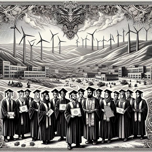 ChatGPT: In Yemen, students proudly receive Bachelor's degrees in Philosophy and religious studies amidst a backdrop of renewable energy sources such as wind turbines and solar panels generating electricity for the local communities.