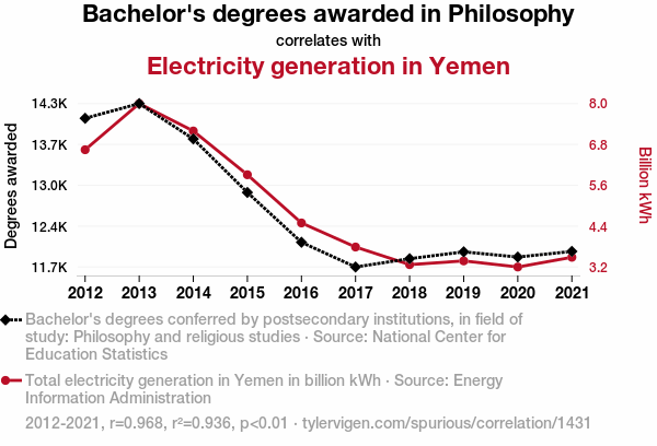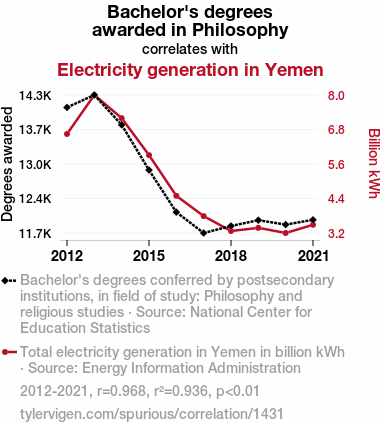 - The spurious research paper: The Illuminating Relationship Between Philosophy and Religious Studies Bachelor's Degrees and Electricity Generation in Yemen: Shedding Light on a Curious Correlation