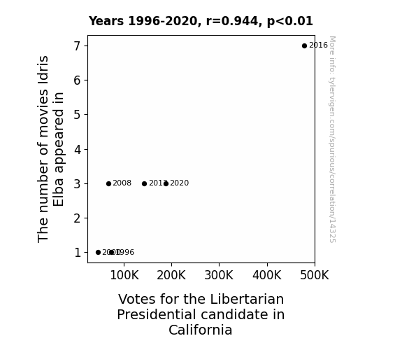 This means 89.1% of the change in the one variable (i.e., Votes for the Libertarian Presidential candidate in California) is predictable based on the change in the other (i.e., The number of movies Idris Elba appeared in) over the 6 years from 1996 through 2020.