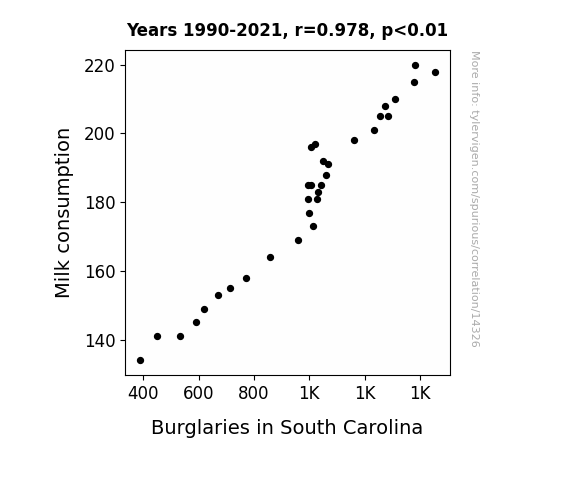 This means 95.6% of the change in the one variable (i.e., Burglaries in South Carolina) is predictable based on the change in the other (i.e., Milk consumption) over the 32 years from 1990 through 2021.