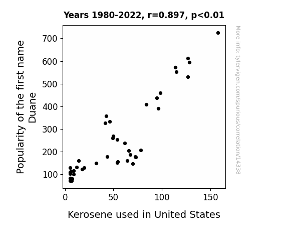 This means 80.4% of the change in the one variable (i.e., Kerosene used in United States) is predictable based on the change in the other (i.e., Popularity of the first name Duane) over the 43 years from 1980 through 2022.