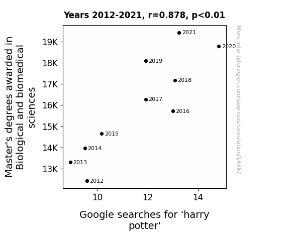 This means 77.1% of the change in the one variable (i.e., Google searches for 'harry potter') is predictable based on the change in the other (i.e., Master's degrees awarded in Biological and biomedical sciences) over the 10 years from 2012 through 2021.