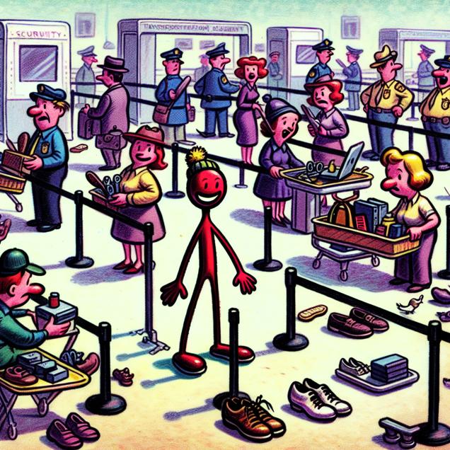 Prompt: An image that looks like it is a scene from A Disney Movie, depicting a stick figure standing in line at an airport security checkpoint. The stick figure is holding various items like shoes, laptops, and liquids. The chart "Number of Transportation Security Screeners in Iowa" is humorously integrated into the background, with the stick figure serving as the data points. In the background, there is a whimsical illustration of an airport security checkpoint with characters reminiscent of a Disney movie engaging in humorous interactions related to airport security measures. The depiction should include only scenes, people, and objects, it should not include text or speech bubbles.