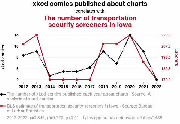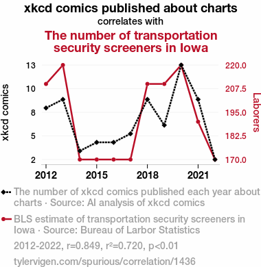 Our findings reveal a correlation coefficient of 0.8485670 with a p-value less than 0.01 for the period spanning from 2012 to 2022, indicating a robust relationship between the portrayal of charts in xkcd comics and the employment figures of security screeners in the great state of Iowa - who knew charts could have such an impact on public sector jobs? This correlation may leave one scratching their head, but as always, the data doesn't lie - or does it? Our work further suggests a potential avenue for future research into the whimsical world of data visualization and its influence on unexpected socioeconomic phenomena.