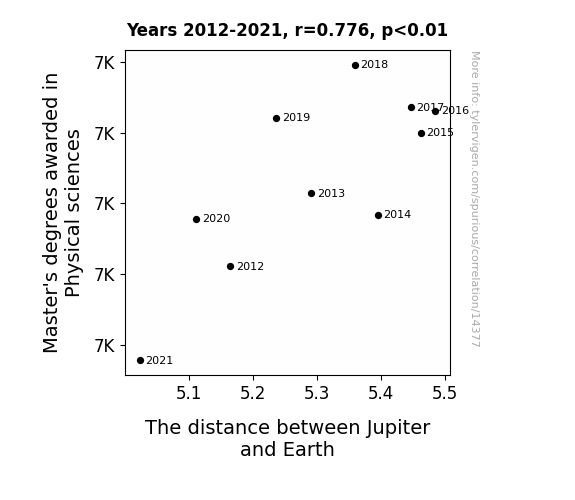 A linear line chart with years as the X-axis and two variables on the Y-axis. The first variable is Master's degrees awarded in Physical sciences and the second variable is The distance between Jupiter and Earth.  The chart goes from 2012 to 2021, and the two variables track closely in value over that time. Small Image