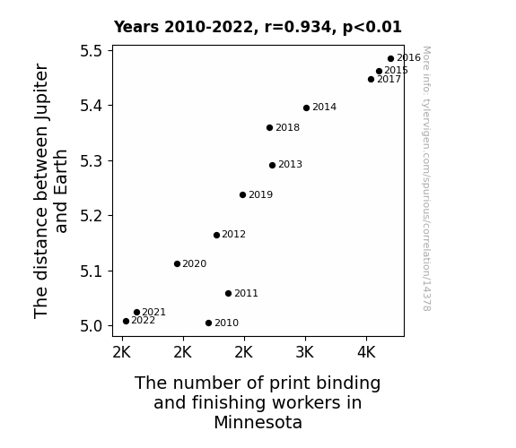 This means 87.2% of the change in the one variable (i.e., The number of print binding and finishing workers in Minnesota) is predictable based on the change in the other (i.e., The distance between Jupiter and Earth) over the 13 years from 2010 through 2022.