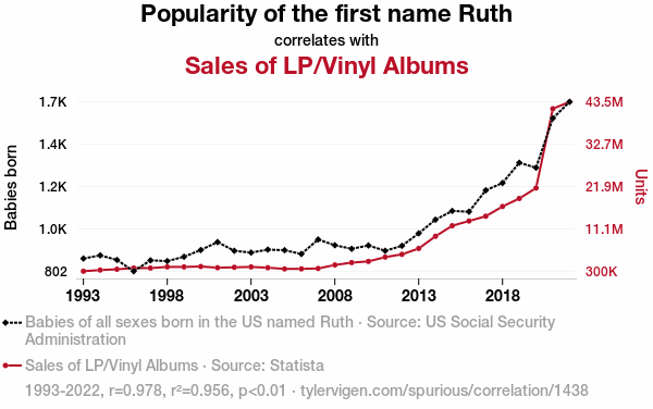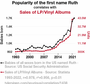 - The spurious research paper: For the Record: Ruth to Tune Ratio – A Groovy Link Between the Popularity of the Name Ruth and Vinyl Album Sales