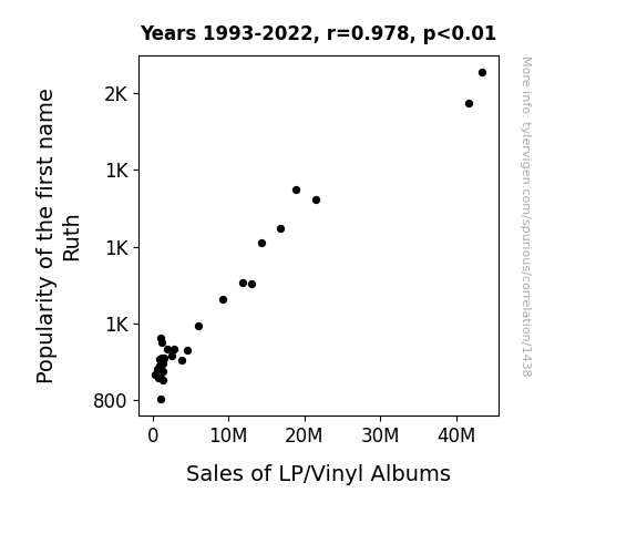 This means 95.6% of the change in the one variable (i.e., Sales of LP/Vinyl Albums) is predictable based on the change in the other (i.e., Popularity of the first name Ruth) over the 30 years from 1993 through 2022.