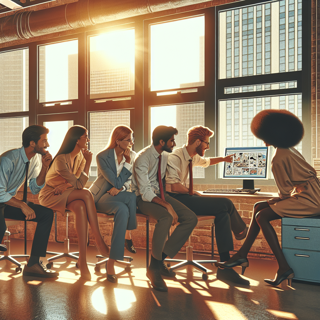 Prompt: [ A photo-realistic image ] Depict a cozy break room in a midwestern office setting, with natural light filtering in through the windows. A group of people dressed in casual office attire are gathered around a computer, with an xkcd comic on the screen. They are engaged and smiling as they read the comic together, with one person pointing at the screen and another leaning in to get a closer look. The scene should capture a sense of camaraderie and shared enjoyment among the data entry keyers. The depiction should include only scenes, people, and objects, it should not include text or speech bubbles.
