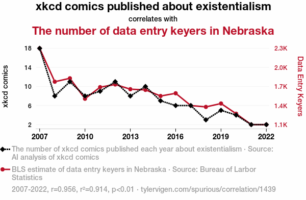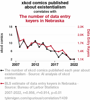 - The spurious research paper: Laughing All the Way to the Data: The Correlation Between xkcd Comics on Existentialism and the Number of Data Entry Keyers in Nebraska