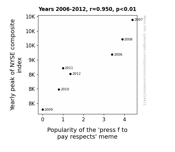 This means 90.3% of the change in the one variable (i.e., Popularity of the 'press f to pay respects' meme) is predictable based on the change in the other (i.e., Yearly peak of NYSE composite index) over the 7 years from 2006 through 2012.