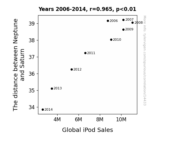 This means 93.1% of the change in the one variable (i.e., Global iPod Sales) is predictable based on the change in the other (i.e., The distance between Neptune and Saturn) over the 9 years from 2006 through 2014.