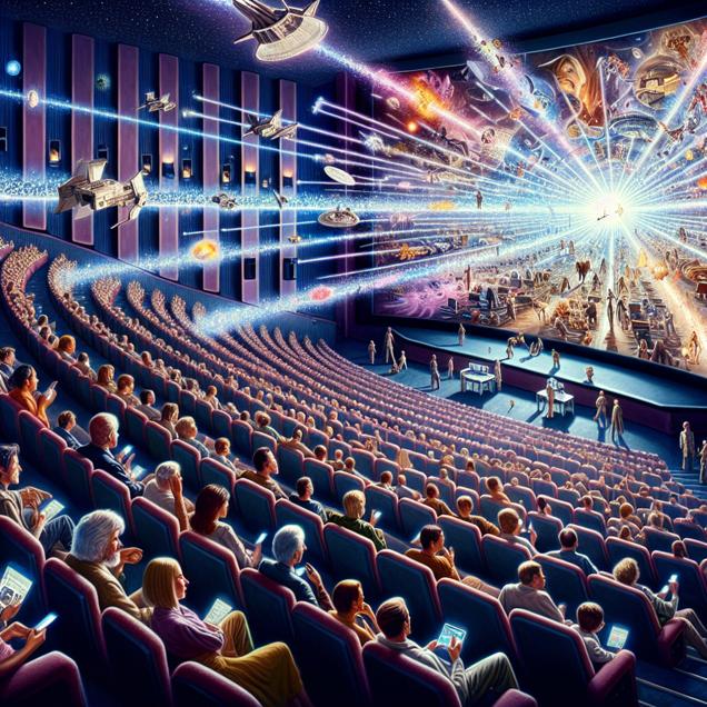 ChatGPT: Create an image that resembles a scene from 'Star Wars' in which a crowded movie theater in the US and Canada is depicted. The theater features a huge screen displaying the latest movie releases, while people sit in their seats, excitedly discussing which movie to watch. Outside the theater, a vast network of websites spans across the sky, showcasing the myriad of online platforms available on the internet. The image should convey the contrast between the traditional cinema experience and the digital realm.