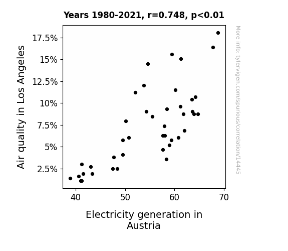 This means 56% of the change in the one variable (i.e., Electricity generation in Austria) is predictable based on the change in the other (i.e., Air quality in Los Angeles) over the 42 years from 1980 through 2021.