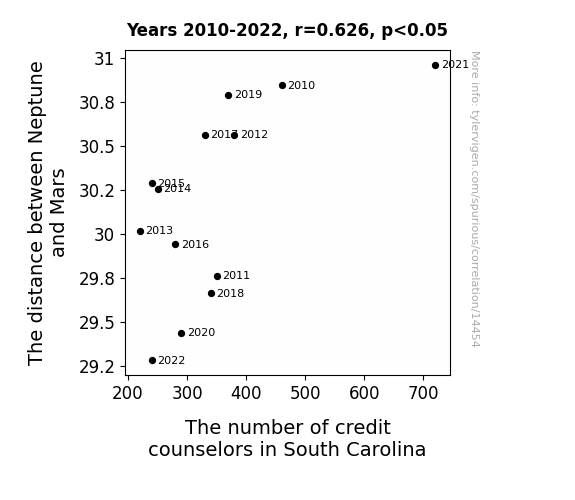 This means 39.1% of the change in the one variable (i.e., The number of credit counselors in South Carolina) is predictable based on the change in the other (i.e., The distance between Neptune and Mars) over the 13 years from 2010 through 2022.