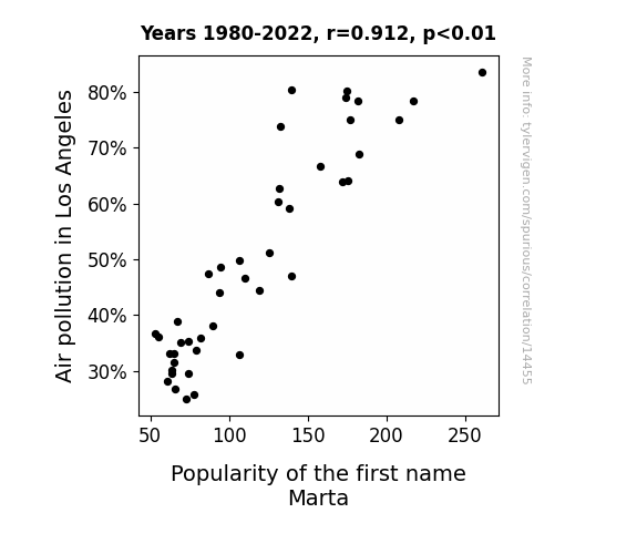 This means 83.1% of the change in the one variable (i.e., Popularity of the first name Marta) is predictable based on the change in the other (i.e., Air pollution in Los Angeles) over the 43 years from 1980 through 2022.