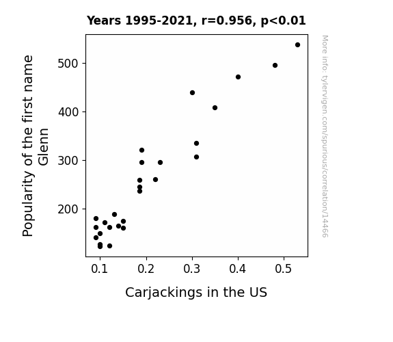 This means 91.4% of the change in the one variable (i.e., Carjackings in the US) is predictable based on the change in the other (i.e., Popularity of the first name Glenn) over the 27 years from 1995 through 2021.