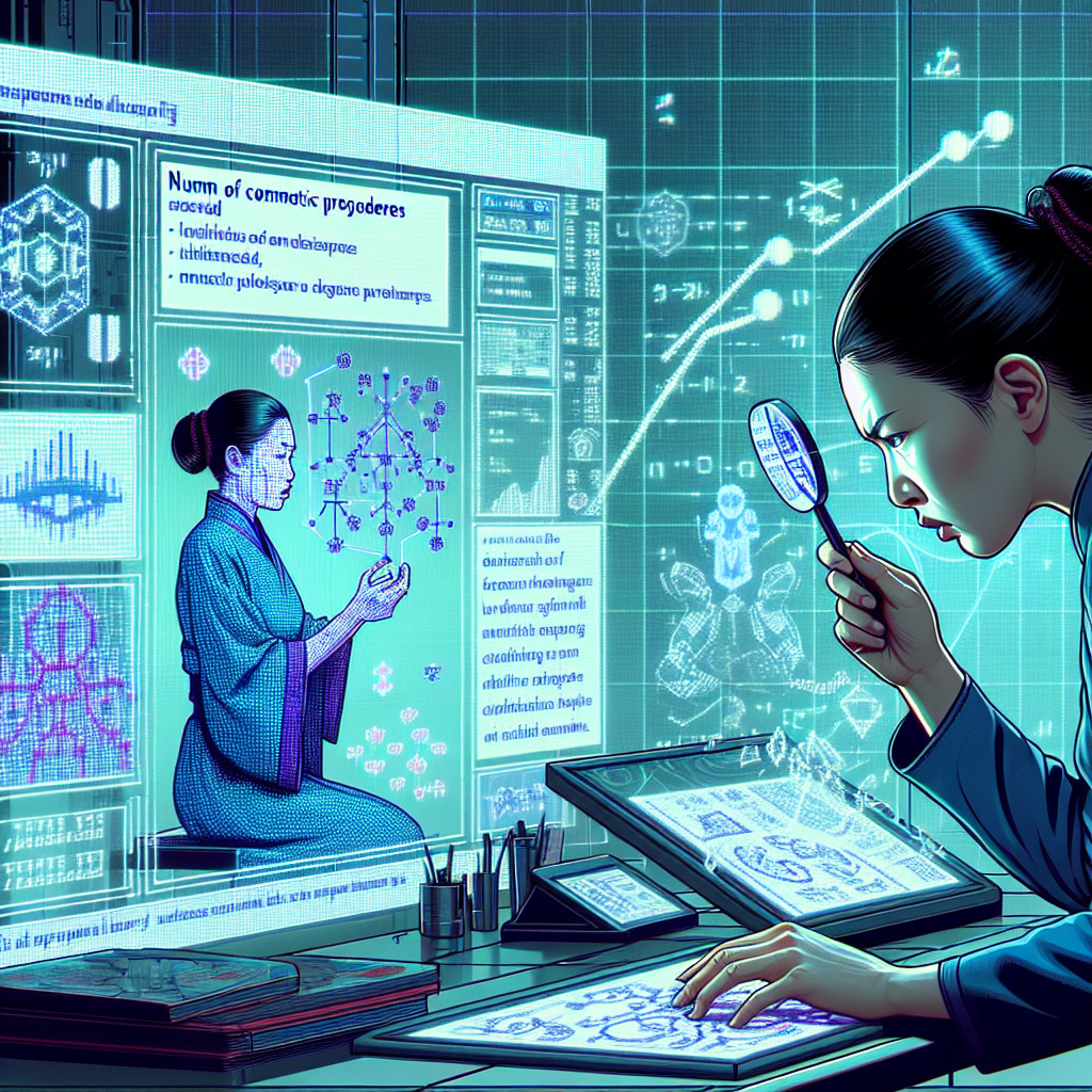 Prompt: Generate an image of a futuristic cyber-inspired illustration. In the center, visualize a woman in a sleek, high-tech environment, focusing intensely on solving a complex puzzle displayed on a holographic interface. The puzzle should contain cryptic symbols and equations reminiscent of an xkcd comic challenge. Behind her, a holographic graph should hover, representing the "Number of Botox Injections Administered to Women" over time, with a noticeable declining trend. The woman's frustrated expression should be highlighted as she grapples with the enigmatic puzzle, conveying her determination and the challenging nature of the task before her. The depiction should include only scenes, people, and objects, it should not include text or speech bubbles.