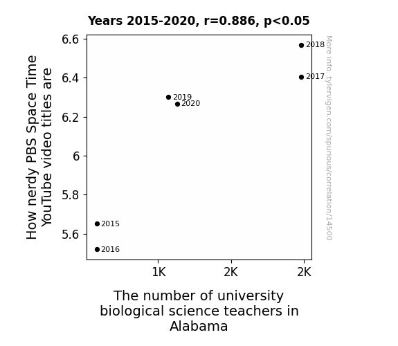 This means 78.5% of the change in the one variable (i.e., The number of university biological science teachers in Alabama) is predictable based on the change in the other (i.e., How nerdy PBS Space Time YouTube video titles are) over the 6 years from 2015 through 2020.