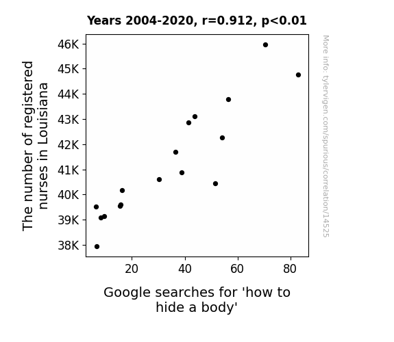 This means 83.2% of the change in the one variable (i.e., Google searches for 'how to hide a body') is predictable based on the change in the other (i.e., The number of registered nurses in Louisiana) over the 17 years from 2004 through 2020.
