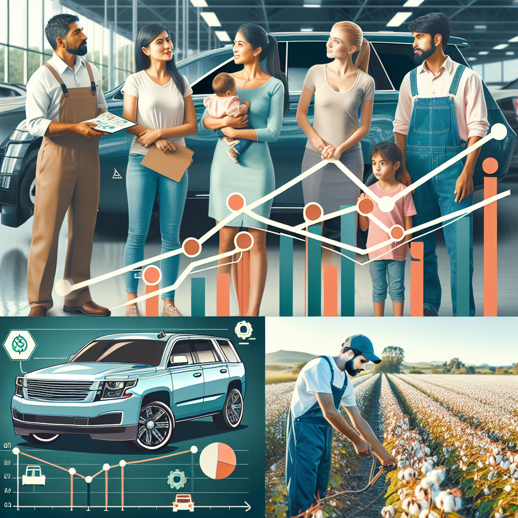 Prompt: The setting is at a car dealership where a family is standing beside a shiny new car with a "for sale" sign on it. The family appears to be observing the car with interest, indicating a potential purchase. As they walk away from the dealership, the family members are seen dressed in casual cotton clothing. In the background, a line chart representing "household spending on vehicle purchases" is displayed with a noticeable downward trend. Additionally, a farmer in Arkansas is depicted tending to his cotton fields using non-GMO methods, highlighting a shift away from GMO usage in cotton production. The imagery captures the interplay between consumer behavior, agricultural practices, and economic trends. The depiction should include only scenes, people, and objects, it should not include text or speech bubbles.